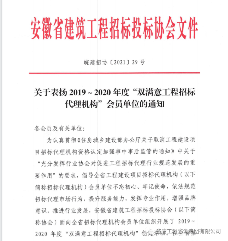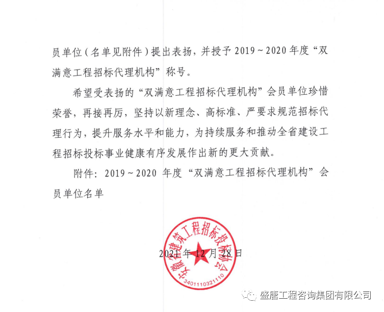 2021年12月28日,安徽省建筑工程BOB亚博协会颁发2019-2020年度“双满意工程招标代理机构”的决定,盛唐集团再次斩获此项荣誉称号