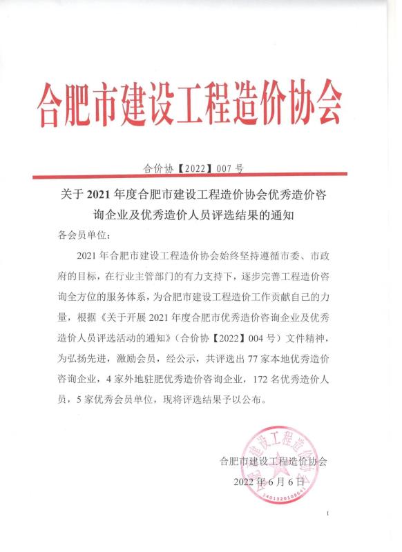 根据《关于开展2021年度合肥市优秀造价咨询企业及优秀造价人员评选活动的通知》(合作协【2022004号)文件精神,为弘扬先进,经合肥市建设工程造价协会审定,爱游戏Home荣获“2021年度合肥市建设工程造价协会优秀造价咨询企业”称号,我司人员李洪垚、赵红艳被授予”优秀造价人员”奖项。
